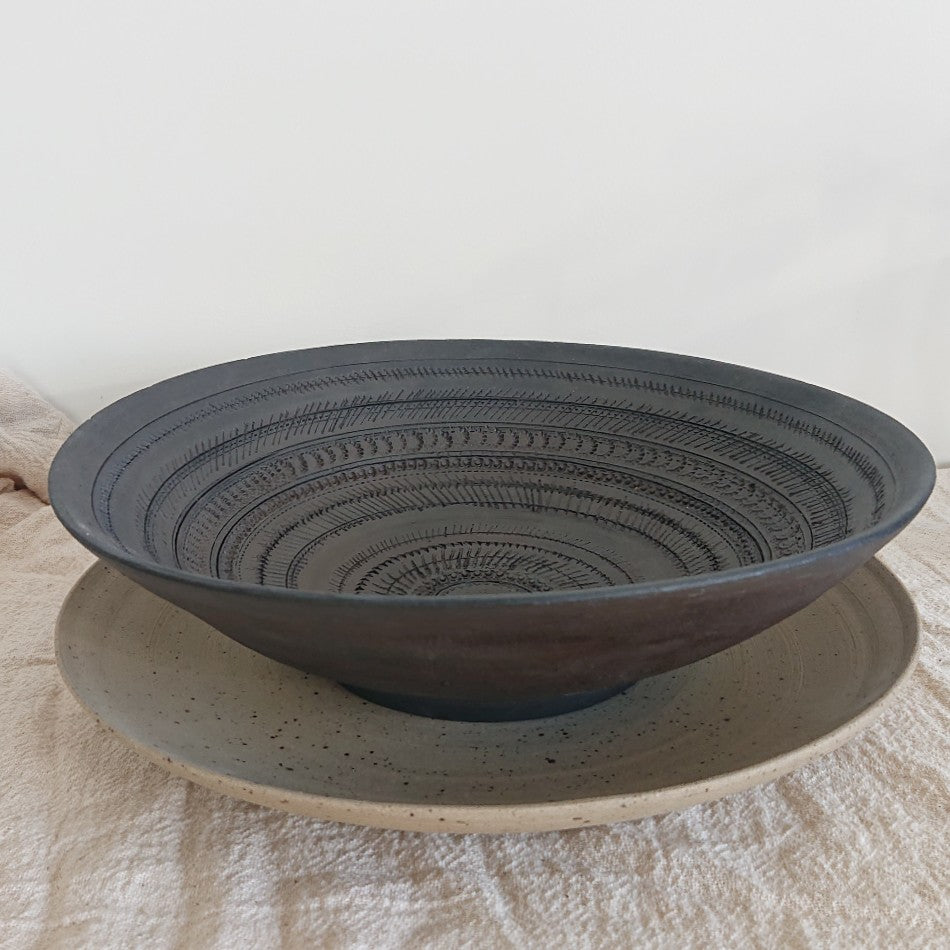 The Kesan bowl is wheelthrown and hand imprinted with hypnotic patterns. It is left unglazed to celebrate the matte dark clay.